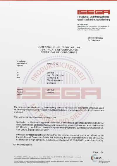 Unsere Reinigungskonzentrate sind als lebensmittelunbedenklich zertifiziert und erfüllen die Vorschriften nach FDA. Sie eignen sich auch zur Reinigung von Maschinen und Werkzeugen, auf denen Lebensmittelverpackungen oder medizintechnische Kunststoffteile hergestellt werden.